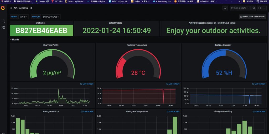 空氣品質監控 在 pm2.5 開放資料入口網站中所提供的感測器儀表板,經由目前擺放在實驗室上層櫃的空氣盒子 (編號 B827EB46EAEB) 所提供之數據,呈現出 pm2.5,溫溼度等相關數值。 網站連結 : https://pm25.lass-net.org/grafana/d/airbox_dashboard_v3/airdata?orgId=2&var-source=MAPS&var-device_id=B827EB46EAEB